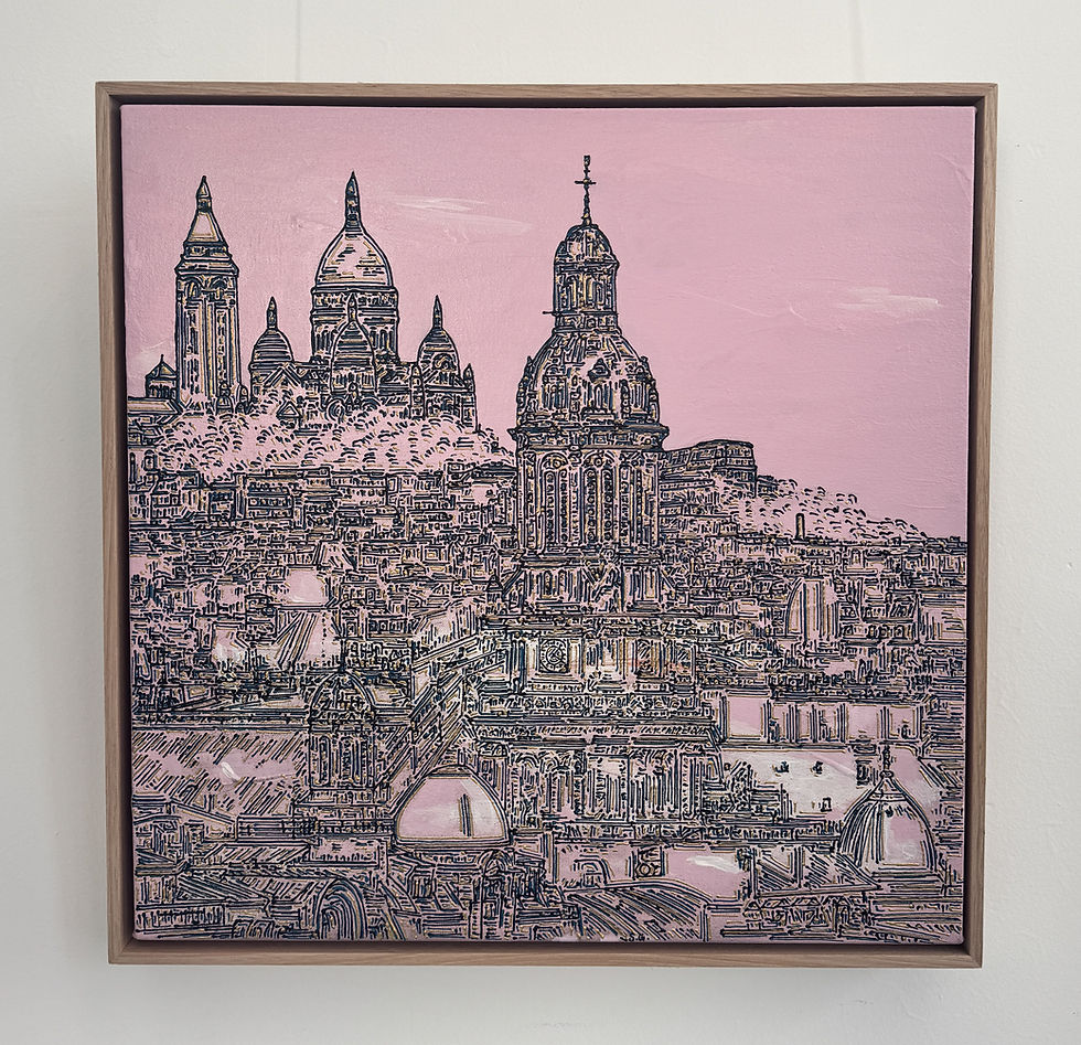 Acrylic on canvas, applied with a dripping technique creating a vibrant lace-like effect, capturing the essence of the classic city-scapes